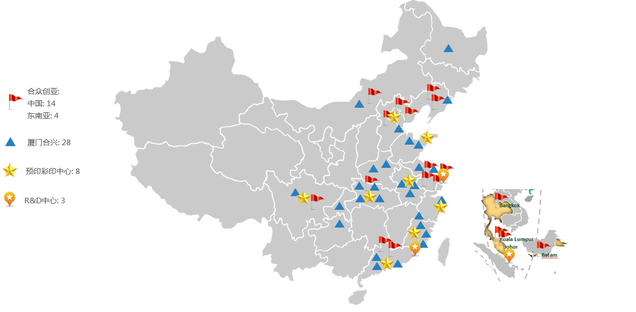 廈門合興包裝印刷股份有限公司,2008年在深交所上市,股票代碼為002228,2016年收購了國際紙業(yè)中國及東南亞的工廠后,總共有46家工廠,現(xiàn)有員工約1萬人,2017年銷售額達(dá)到85億人民幣。